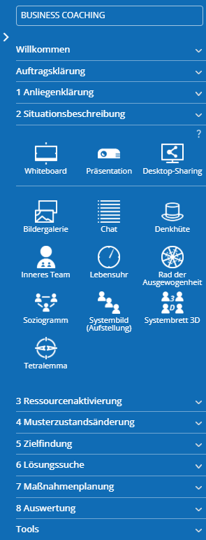 Funktionsumfang: Online-Coaching mit 18 Tools (Format Business-Coaching) und bis zu 3 gleichzeitig Teilnehmenden in Sitzungen.
